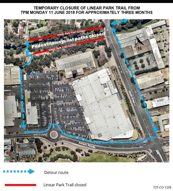 The Linear Park Trail will be temporarily closed between McDonnell Avenue and South Road from 7pm Monday, 11 June for approximately three months.