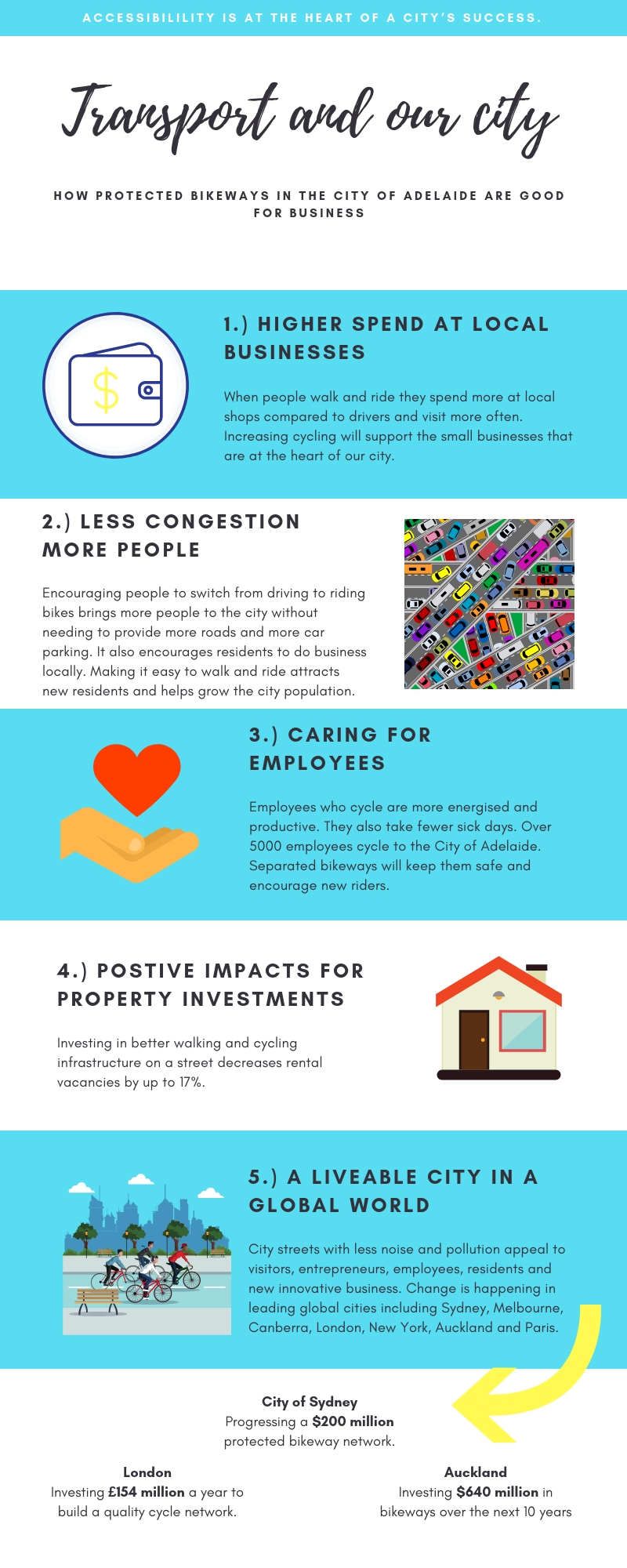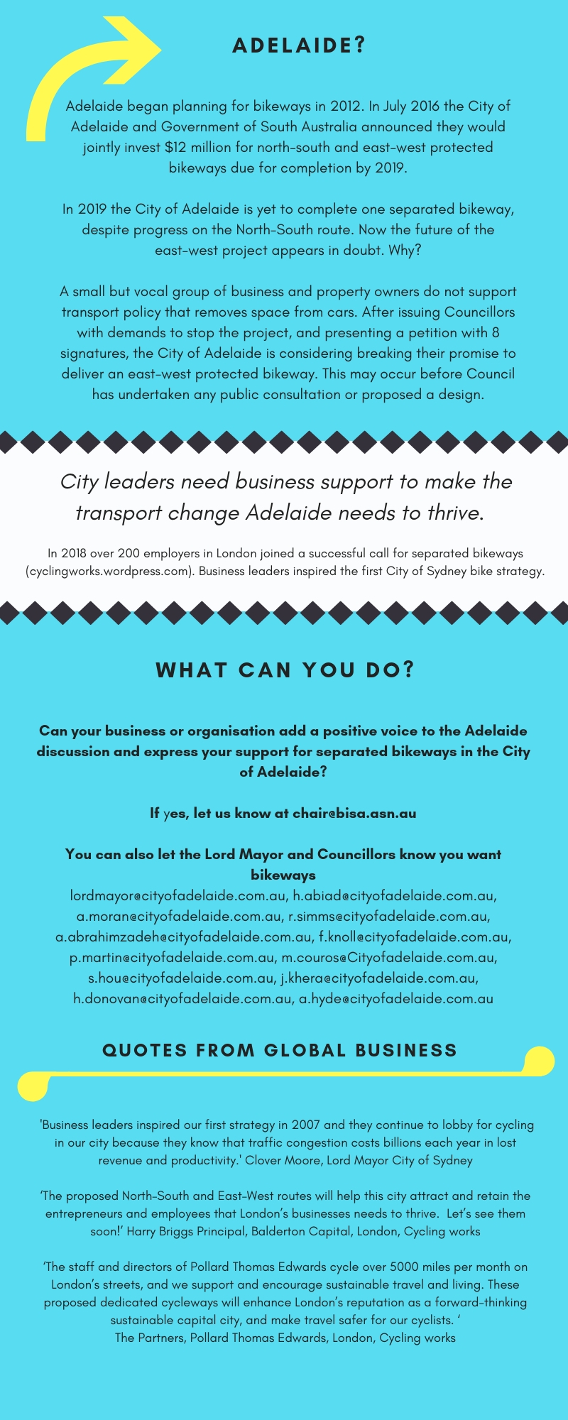 Bikeways are good for business This entry was posted on February 8, 2019 Encouraging businesses to support Adelaide City Council to build a safe and connected Bikeways Network.
