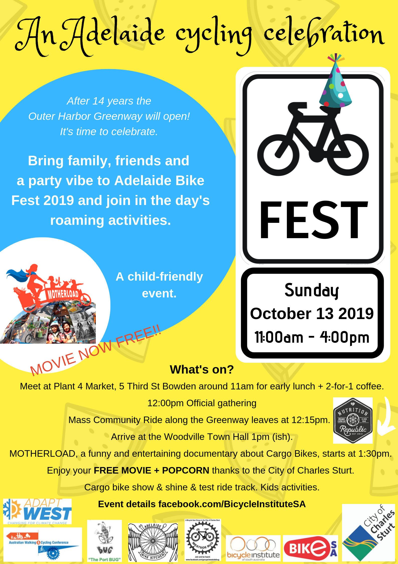 The ride ends at the Woodville Town Hall, an elegant and beautiful theatre recently restored. At 1:30pm a FREE screening of MOTHERLOAD will begin; a crowdsourced documentary about living by bike and the amazing adaptability of the cargo bike. It is a not to be missed once only screening in Adelaide http://motherloadmovie.com/welcome#trailer-section. Enjoy FREE MOVIE + POPCORN thanks to the City of Charles Sturt who are working hard to encourage people to Cycle Instead. Thank you to all Councillors for their support of our event.