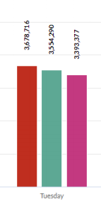 The second graph totals the numbers of visitors to the city on the Tuesdays of the first three months of 2019, 2020 and 2021. The 2020 figure (green) is 3.4% below the 2019 figure (red). The 2021 figure (mauve) is 7.7% below the 2019 figure and 4.5% below the 2020 figure. Note however that this presents the situation for all Tuesdays over first three months. Figure 1 indicates that the situation varied a lot over the early part of the year and also that at the time of the Super Tuesday count (the beginning of March) numbers visiting the CBD in 2020 and 2021 were about the same.