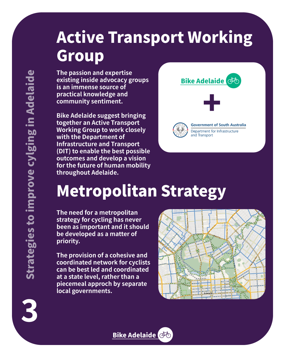 Historically, government strategies have focused on cycling as a recreational activity, over a genuine alternative to driving for commuting and utility. Here, Bike Adelaide propose a number of foundational strategies that would help to make cycling a more attractive, useful and dependable mode of transport.