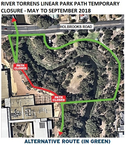 I write to notify that the River Torrens Linear Park Shared Use Path on the northern side of the River, west of Holbrooks Road, will be closed temporarily from late-May to September 2018. Please see attached map showing detour to Holbrooks Road footpath, shared use path on southern side of the River and Montgomery Reserve / Styles Place bridge.